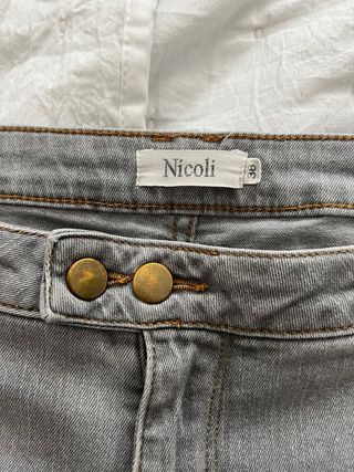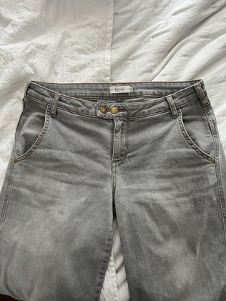 Vaqueros de tiro bajo en tono gris. - Cintura con trabillas. - Cierre de cremallera y botón. - Bolsillos delanteros y traseros.
