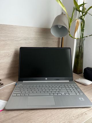 Ordenador portátil HP en color plata. Diseño moderno y ligero, ideal para el día a día. Viene con cargador. - Pantalla de 15 pulgadas. - Teclado numérico integrado. - Touchpad amplio y sensible. Regalo ratón y funda.