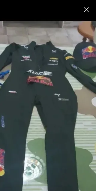 Disfraz de piloto de Fórmula 1 con diseño inspirado en Red Bull. - Color negro - Talla M - Incluye varios logos de patrocinadores.