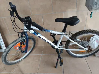 Bicicleta infantil de la marca Rockrider, ideal para iniciarse en el ciclismo. - Cuadro blanco con detalles azules. - Ruedas de 20 pulgadas. - Frenos delanteros y traseros.6 velocidades