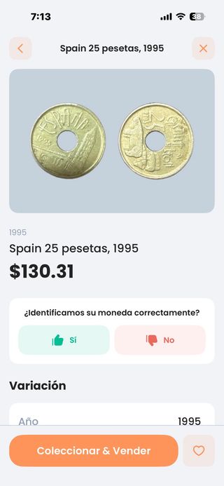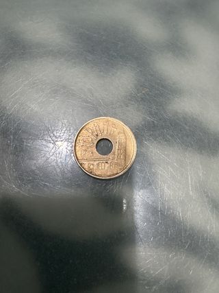 Moneda de 25 pesetas de España del año 1995. - Diseño con agujero central. - Canto liso.