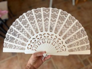Elegante abanico de encaje de bolillos, ideal para bodas o como regalo especial. - Diseño delicado de bolillos. - Varillas de madera de abedul calada. - Color blanco roto - Medida abierto 46 cm, cerrado 24,5 cm
