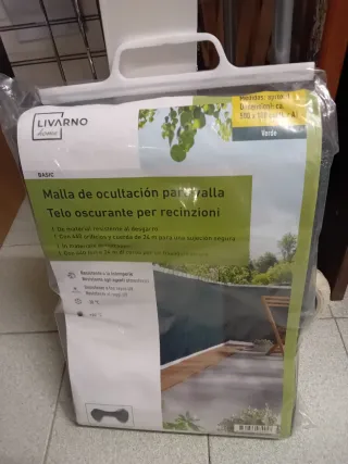 Se venden dos mallas de ocultación de la marca Livarno Home, en color verde y con unas dimensiones de 5 metros de largo por 1 metro de alto. Son nuevas y vienen en su embalaje original. - Material resistente al desgarro. - Incluye 440 orificios y 24 m de cuerda para una sujeción segura. - Resistente a la intemperie y a los rayos UV. - Soporta temperaturas de -30°C a +60°C.