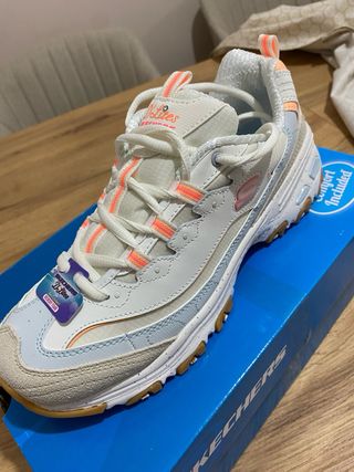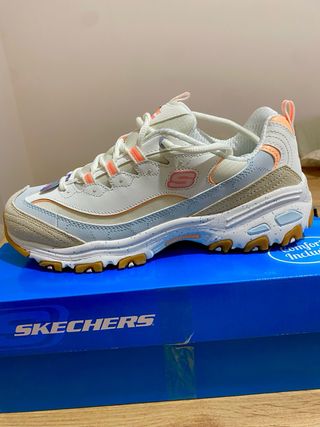 Zapatillas deportivas Skechers para mujer con un diseño moderno y llamativo. - Combinación de colores blanco, azul claro, beige y detalles en coral. - Logo de Skechers en los laterales. - Suela de goma con buen agarre. - Cierre con cordones. Son Nuevas, las vendo porque se me a pasado el plazo de devolución de la tienda.