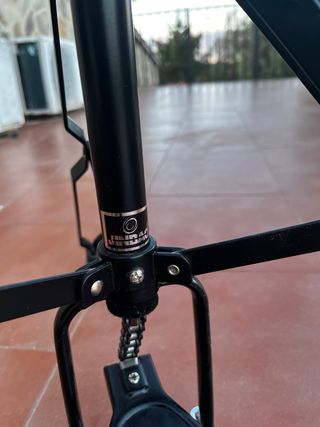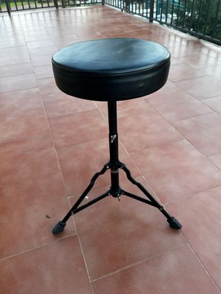 Asiento de batería con altura regulable y base de trípode. Pertenecía a una batería marca JINBAO - Asiento acolchado de cuero sintético negro. - Base de trípode metálica negra. - Altura ajustable mediante mecanismo de tornillo y palomilla