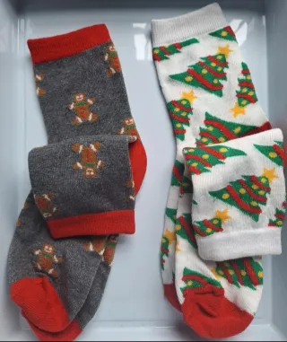 Calcetines con divertidos diseños navideños. - Diseño de hombrecillos de jengibre sobre fondo gris. - Diseño de árboles de Navidad sobre fondo blanco. - Puños y talones en color rojo.