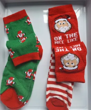Conjunto de calcetines con temática navideña y diseño de Santa Claus. - Diseño de Santa Claus y adornos festivos. - Puño y talón en contraste.