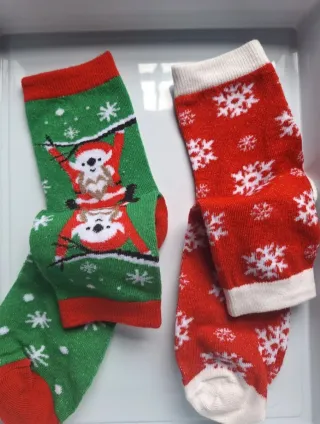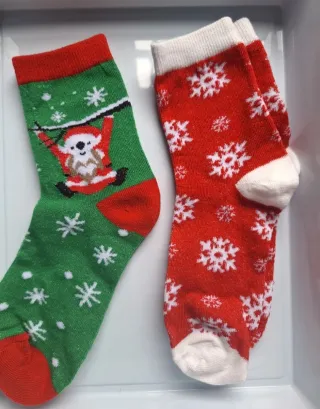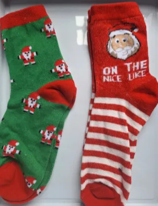Calcetines con divertidos diseños navideños. - Diseño de Santa colgando en uno. - Diseño de copos de nieve en el otro. - Puño y talón en contraste.
