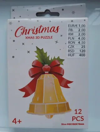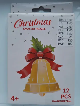 Puzzle 3D con temática navideña, con forma de campana. - Contiene 12 piezas. - Edad recomendada: 4+ años. - Dimensiones: 98x128x78mm.