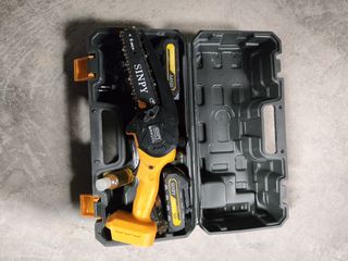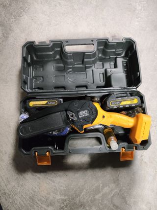 Mini motosierra eléctrica SINPY, ideal para trabajos de poda y jardinería. Se incluye maletín para su transporte y almacenamiento. - Incluye dos baterías. - Incluye cargador. - Incluye aceite lubricante.