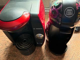 Se venden dos cafeteras, una Dolce Gusto y otra Tassimo. 25€ cada una o 40€ las 2. **CAFETERA L’OR roja usada solo para probarla con vale de 20€ y 9 cápsulas por 40€** - Cafetera Dolce Gusto con diseño Custo Barcelona. - Cafetera Tassimo en color rojo y negro.