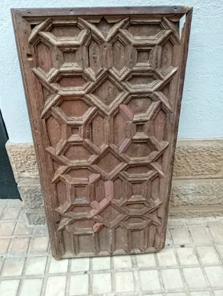 Puerta antigua de madera con un intrincado diseño tallado. Presenta un patrón geométrico repetitivo que le confiere un carácter único. - Material: Madera. - Diseño: Tallado geométrico. - Estilo: Rústico/Antiguo.
