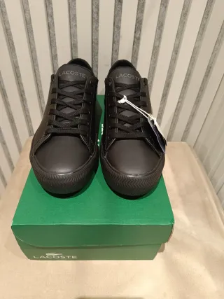 Zapatillas de la marca Lacoste en color negro. - Talla 39. - Diseño clásico y versátil. - Detalle del icónico cocodrilo de Lacoste.