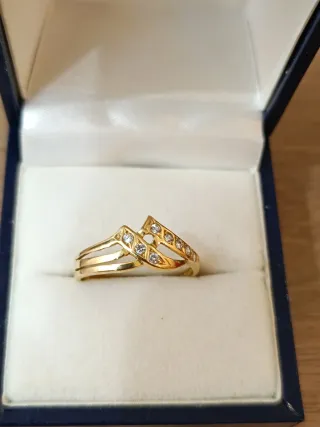 Elegante anillo de oro de 18 quilates. Talla 15/17,5mm. El sello es portugués. - Diseño moderno con detalles. - Adornado con pequeñas piedras brillantes.