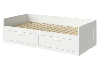 Cama versátil Brimnes de Ikea, ideal como individual o de matrimonio. Cuenta con espacio de almacenamiento integrado. - Dos cajones amplios para guardar objetos. - Diseño moderno y funcional.