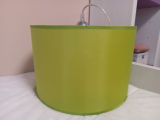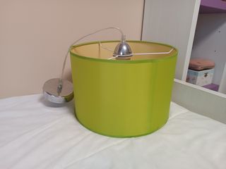 Lámpara de techo con un diseño moderno y un llamativo color verde. - Pantalla cilíndrica de tela. - Estructura metálica plateada. - Cable ajustable.