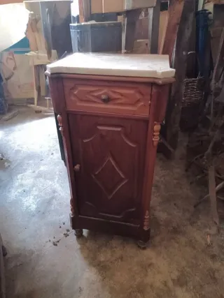 Elegante mesita de noche antigua de madera de caoba con tapa de mármol y estructura de madera. Diseño clásico con un cajón. Puerta con detalle tallado.Patas torneadas. Medidas: 39 ancho x 30 fondo x 82 de altura.