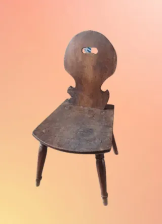 Silla antigua de madera de castaño con un diseño único. Patas torneadas. Respaldo curvo con un detalle. Asiento con detalles. Acabado natural. Altura 35cm