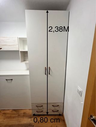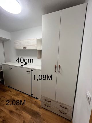 Conjunto de muebles para dormitorio o estudio. Negociable - Armario alto con puertas y cajones inferiores. - Cama abatible integrada en un mueble horizontal. - Estantes superiores para almacenamiento.