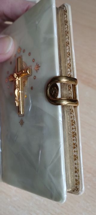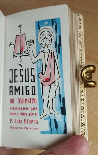 Devocionario de la Editorial Regina del año 1965 del Misionero Claretiano P. Luis Ribera que mide 11 cm de alto por aprox. 6´5 cm y numerado 622/671. - Tapas elaboradas con nácar. - Cruficijo dorado en relieve. - Cierre metálico dorado.