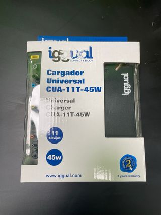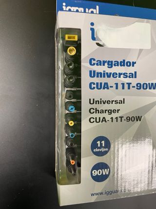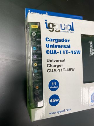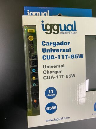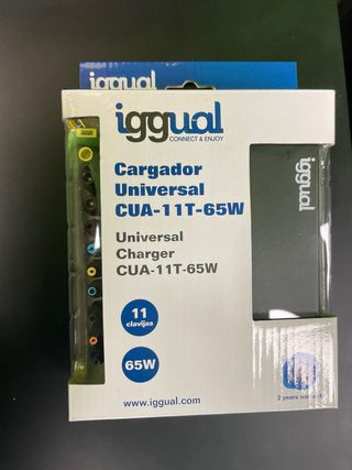 Cargador universal de la marca Iggual, modelo CUA-11T-65W. - Potencia de 65W. - Incluye 11 clavijas para diferentes dispositivos.