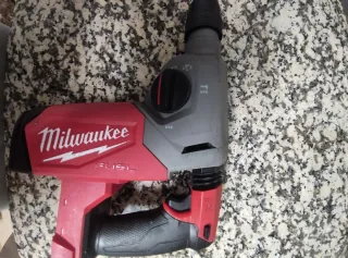 Martillo rotativo de la marca Milwaukee. Herramienta robusta y versátil. - Mango ergonómico para un mejor agarre. - Cuerpo principal en color gris y rojo. - Selector de modo de funcionamiento.