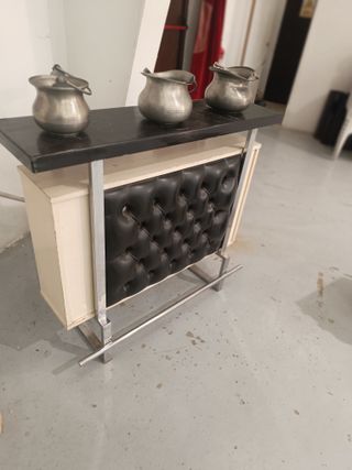 Barra de bar antigua, años 50 totalmente restaurada. Estilo retro. Diseño vintage. Tapizado de piel con botones. Estructura de madera y cromado. Su diseño combina una superficie superior oscura con un frente tapizado en piel negra. Licorera trasera. Medidas: 116 cm x 32,5 cm x 101 cm alto. Las vasijas de la imagen no están incluidas.