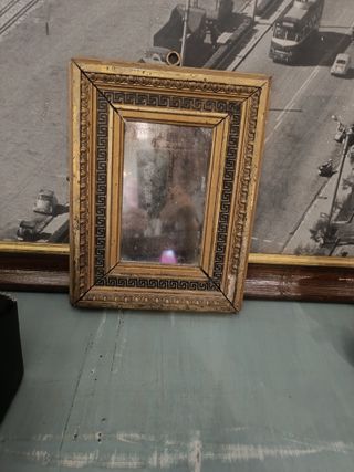 Espejo pequeño antiguo con marco decorativo de origen. Medidas exteriores: 25cm x 30 cm x 4 cm de fondo. Medidas interiores del espejo: 17cmx10cm.