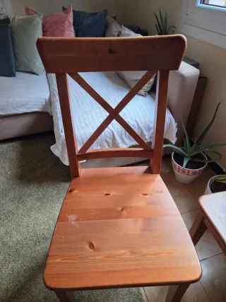 4 Sillas de comedor de madera de la marca Ikea. Su diseño clásico se adapta a cualquier estilo. - Patas robustas para mayor estabilidad. - Respaldo con diseño cruzado. Usadas pero en buen estado y funcionales 12.5 cada silla