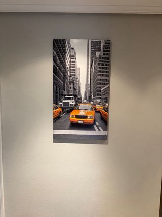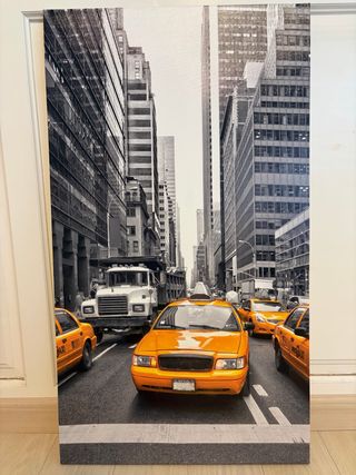 Decoración de pared con escena urbana de Nueva York. Presenta taxis amarillos y edificios emblemáticos. - Impresión sobre tela. - Diseño en blanco y negro con detalles en amarillo.