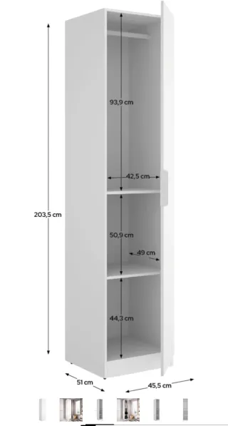 Armario de baño y almacenaje con un diseño moderno y funcional. Ideal para organizar tus artículos de aseo y otros objetos. - Alto: 203,5 cm - Ancho: 45,5 cm - Profundidad: 51 cm - Compartimento superior: 93,9 cm de alto - Estante intermedio: 50,9 cm de alto - Compartimento inferior: 44,3 cm de alto - Ancho interior de los estantes: 42,5 cm - Profundidad interior de los estantes: 49 cm