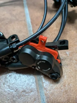 Set de frenos hidráulicos Shimano MT420 con 4 pistones. Sin usar, desmontados de bici nueva. Incluye pastillas nuevas y latiguillos.