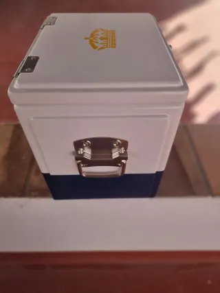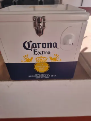 Nevera portátil con diseño clásico y el logo de Coronita. - Color blanco y azul marino. - Asa metálica para facilitar el transporte. - Cierre de seguridad.