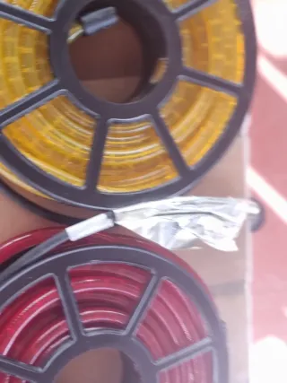 Luces navideñas enrolladas en carretes, listas para usar. Incluye un carrete de luces rojas y otro de luces amarillas. - Carrete de luces rojas. - Carrete de luces amarillas.