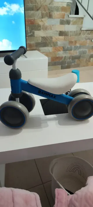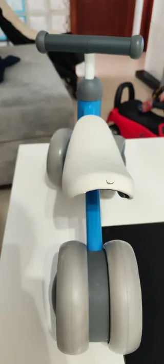 Bicicleta de equilibrio de color azul y blanco, diseñada para los más pequeños. - Asiento blanco. - Ruedas grises.