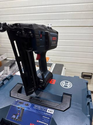 Clavadora profesional Bosch GNH 18V-64M en su maletín. - Incluye cargador y dos baterías. - Maletín de transporte con inserto de espuma.