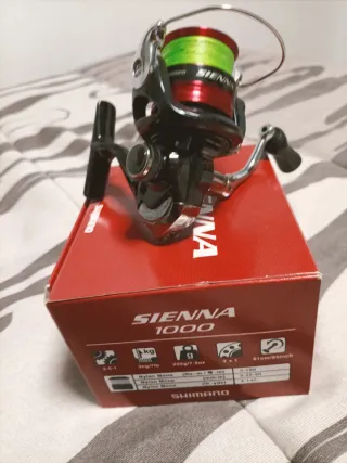 Carrete de pesca Shimano Sienna 1000 con hilo verde y rojo. - Modelo: Sienna 1000. - Color del hilo: Verde y rojo.