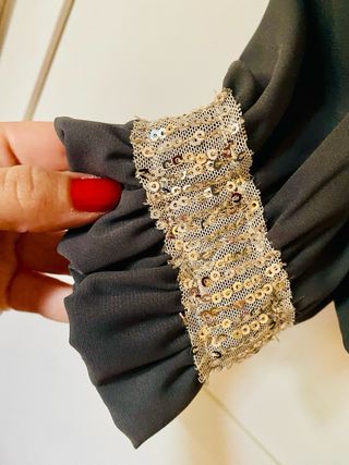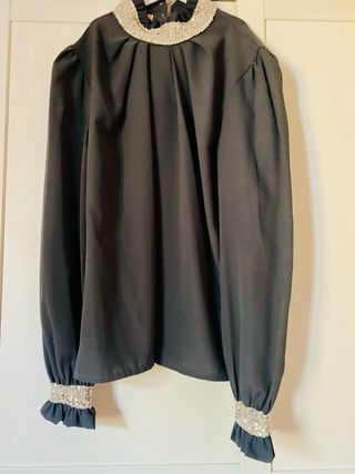 Elegante camisa de manga larga con detalles brillantes. - Cuello alto con adornos. - Puños con pedrería.