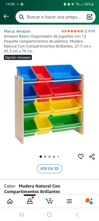 Organizador de juguetes Amazon Basics con 12 compartimentos. - Estructura de madera natural. - Compartimentos de plástico brillantes. - Medidas: 27.7 cm x 85.3 cm x 79 cm. Está completamebte nuevo, usado cinco meses, no tiene ningún rasguño ni desperfecto, ni la madera ni las cajas. Se vende por cambio de mobiliario. Está desmontado.