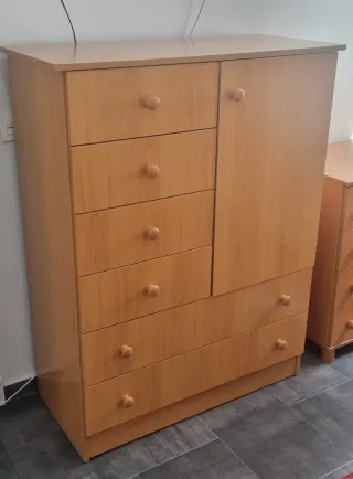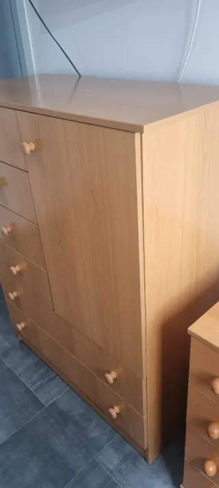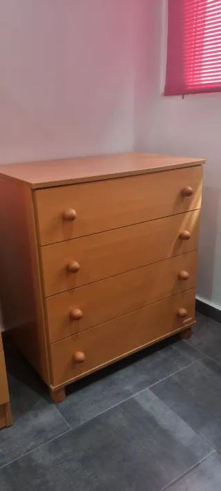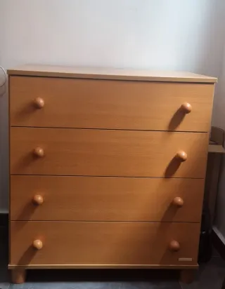 Cómoda de madera con un diseño sencillo y funcional. - Cuatro cajones amplios. - Tiradores redondos de madera. - Acabado en tono madera natural.
