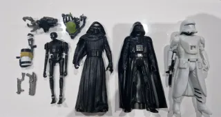 Colección de figuras de Star Wars. - Incluye Darth Vader, Kylo Ren, un Stormtrooper y el droide K-2SO. - Vienen con accesorios. - Figuras detalladas para coleccionistas.
