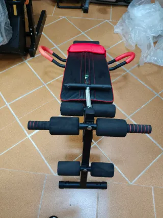 Banco para ejercicios abdominales y de remo. - Estructura metálica negra. - Asiento y respaldo acolchados en rojo y negro. - Mangos de espuma para agarre cómodo.