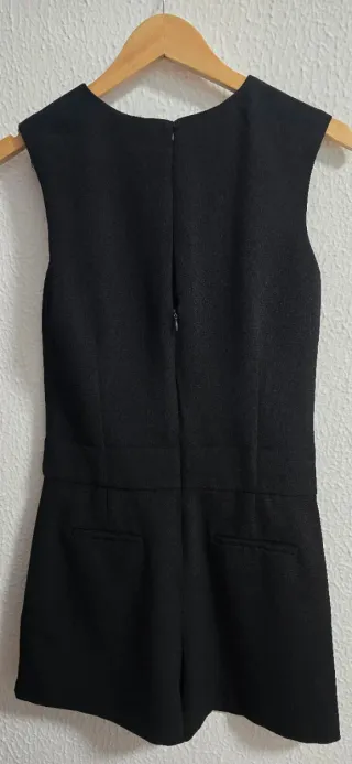 Mono en color negro, de diseño minimalista y atemporal. Una prenda versátil y elegante, adecuada tanto para ocasiones formales como para un look más relajado según los complementos. - Sin mangas. - Bolsillos laterales funcionales. - Pinzas delanteras que aportan estructura y estilizan la silueta. - Cierre con cremallera. - Pequeña abertura en la espalda con botón como detalle sutil. Talla XS, aunque por su corte y caída resulta ideal también para una S. Confeccionado en tejido de buena caída y acabado cuidado. Se encuentra en muy buen estado, está como nuevo! Una prenda básica y sofisticada para cualquier armario.