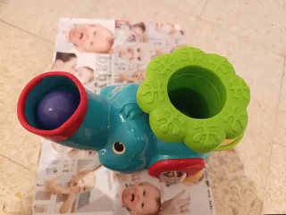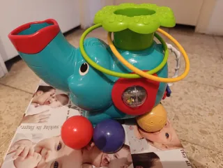 Divertido juguete con forma de elefante, ideal para los más pequeños. Tiene música y cuando se pulsa en la zona verde expulsa las pelotas. Incluye aros de colores para encestar. Viene con dos pelotas de colores: naranja y morada. Apenas se ha usado.