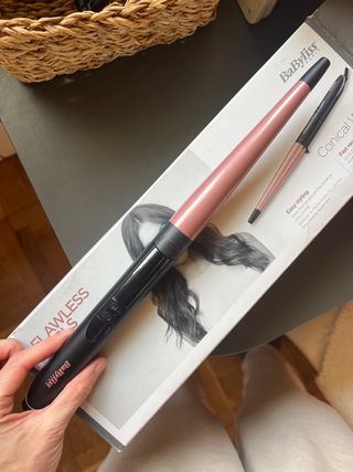 Tenacilla rizadora cónica de la marca BaByliss, con un diseño elegante en tonos rosa y negro. - Barril cónico para crear ondas naturales. - Mango ergonómico para un agarre cómodo.