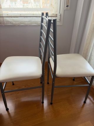 Se venden dos sillas con estructura de aluminio y asientos de piel sintética. - Diseño moderno y ligero. - Asientos cómodos y fáciles de limpiar. -Altura: 90cm Anchura asiento: 40x43cm