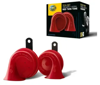 Set de dos bocinas tipo trompeta HELLA en color rojo. - Modelo: TE24 Set - Voltaje: 12V - Sonido: Twin Tone - Nivel de sonido: 110dB