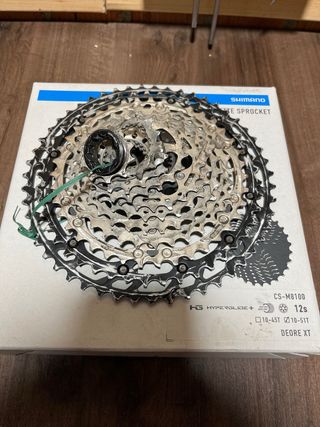 Cassette Shimano Deore XT de 12 velocidades. - Modelo: CS-M8100. - Rango de piñones: 10-51T. - Tecnología: Hyperglide+.
