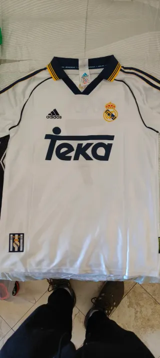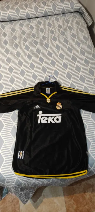 Pack de camisetas del Real Madrid. - Camiseta blanca con detalles en azul marino y dorado. - Logo de Adidas y escudo del Real Madrid bordados. - Inscripción 'Teka' en el frontal. - Talla S - Camiseta de fútbol negra con detalles amarillos, dorsal número 7 y nombre RAUL en la espalda. - Color: Negro y amarillo. - Nombre: RAUL. - Número: 7. -Talla: M