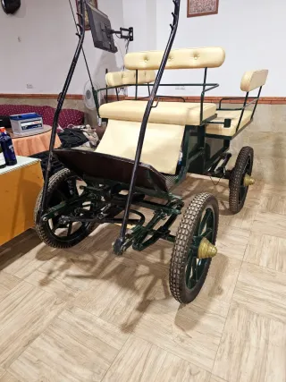 Jardinera tipo carro para ponis, modelo Wells. - Asientos acolchados en color crema. - Estructura metálica. - Ruedas de goma. - Pedales de freno hidraulico.